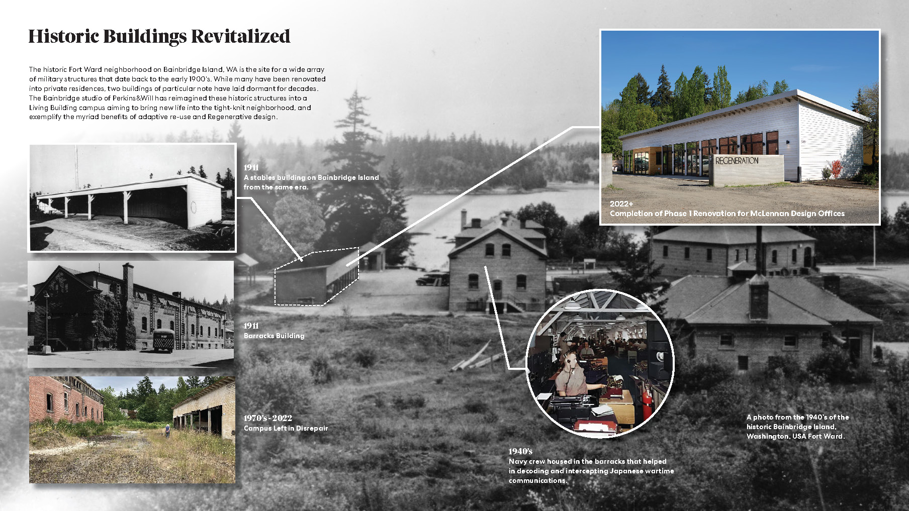 Once a coal storage barn and horse stable from 1911, now a net-positive, regenerative design studio—The Stables at Fort Ward is a bold reinterpretation of historic architecture for a new era. Located in Kitsap County’s Fort Ward Historic District on Bainbridge Island, the first phase of this multi-year transformation converts a nationally registered military structure into the new workplace for McLennan Design and Perkins&Will’s Bainbridge studio. Designed to meet the rigorous standards of the Living Building Challenge, the adaptive reuse project preserves the building’s original timber frame and historic character while introducing state-of-the-art systems for energy, water, and health. With biophilic interiors, an all-electric infrastructure, and the lowest embodied carbon of any Perkins&Will office globally, The Stables proves that preservation and innovation are not opposites—but powerful partners in shaping a future that’s resilient, inclusive, and deeply rooted in place.
