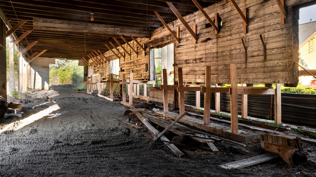 Though the linear, roughly 20-foot-wide building was listed on the local historic registry, it was largely written off as a teardown. Its time serving as a stable and coal storage facility showed: The bottom two feet of the structure had rotted away under layers of dirt, coal ash, and other waste such that only six cast-iron stanchions kept it standing. But from two feet up, the beauty of the original wood framing and roof trusses was apparent through the dust and debris.