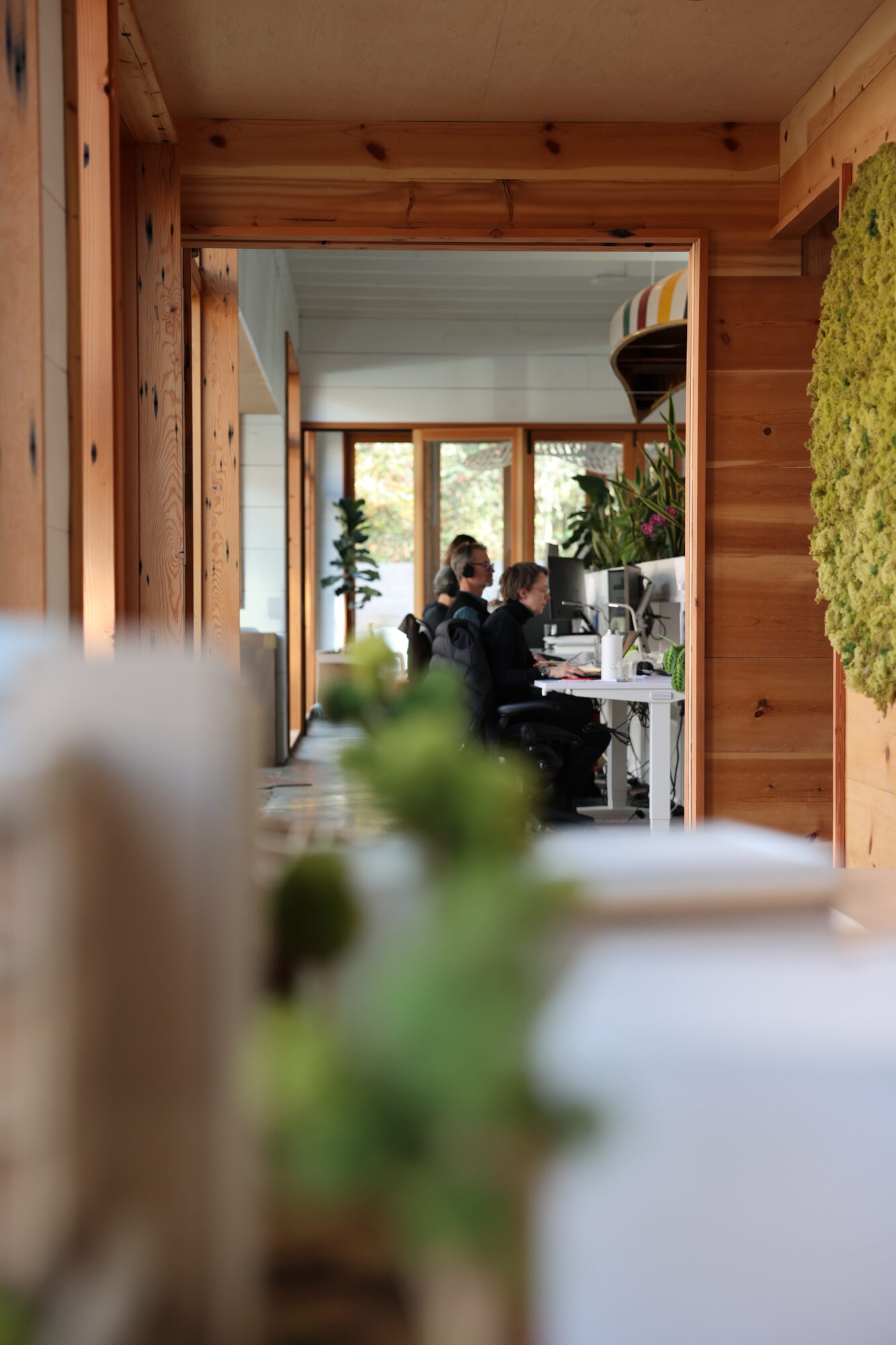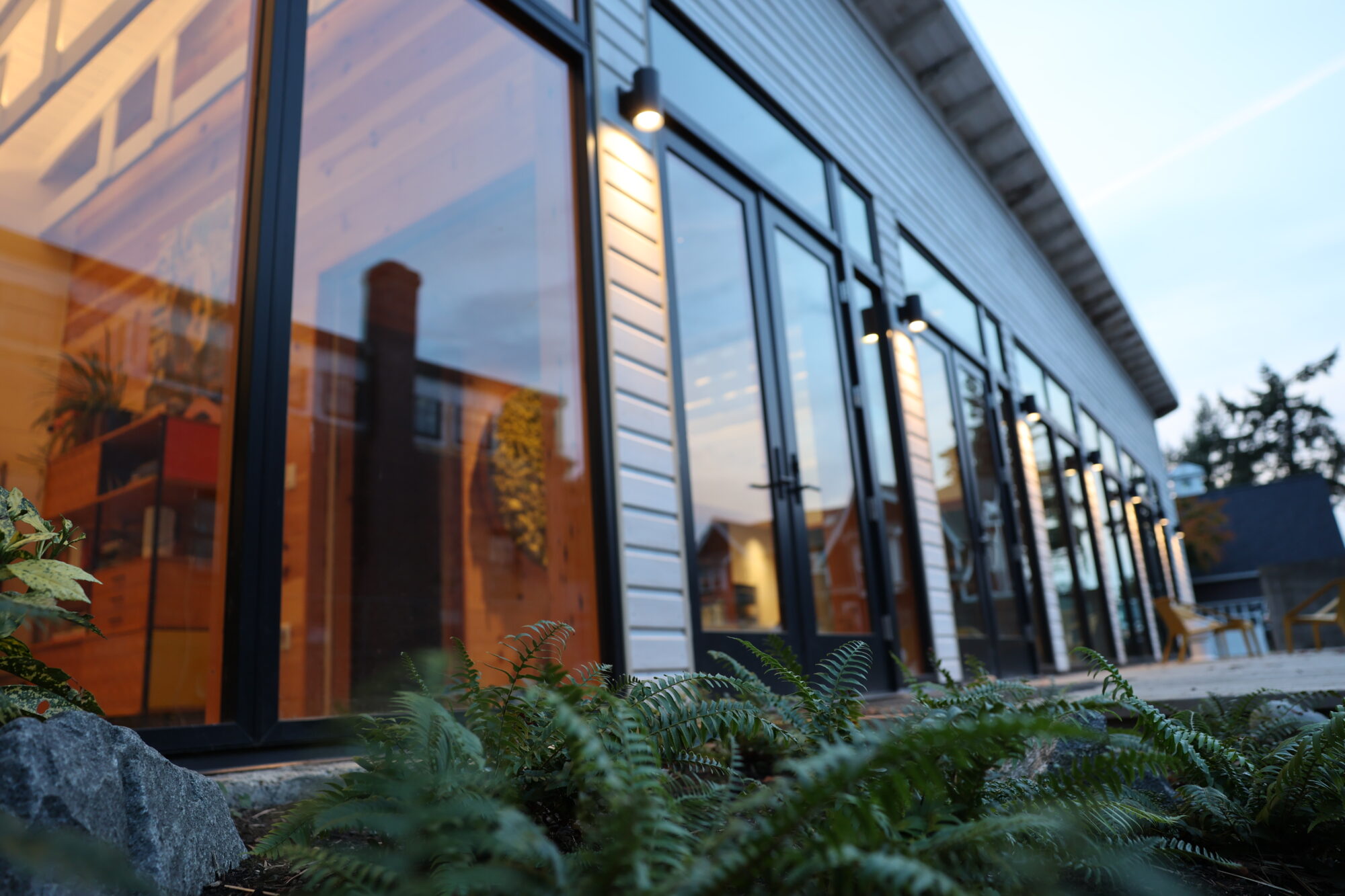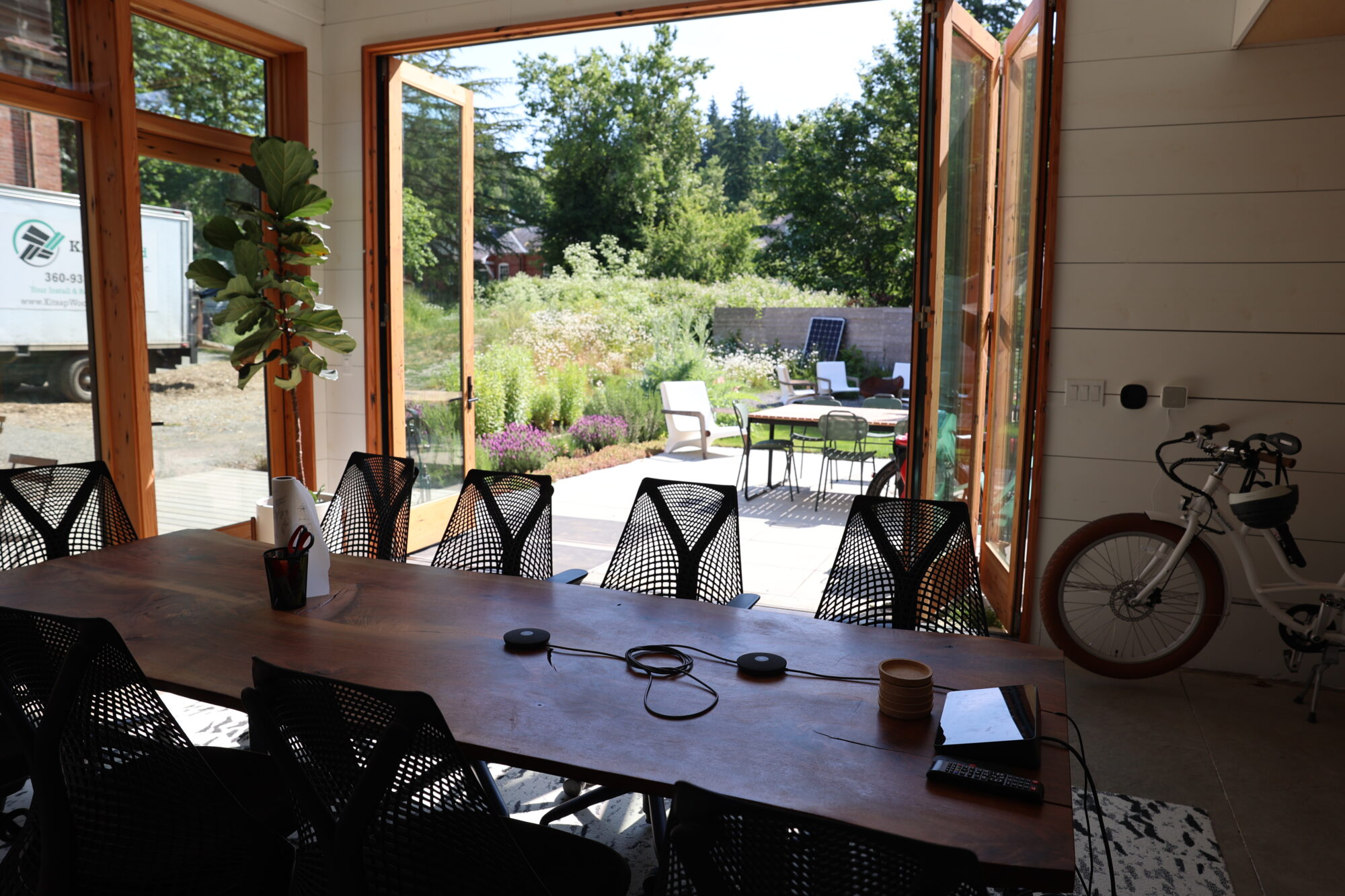 Salvaged douglas-fir folding doors allow the conference room to open out onto our landscaped patio and garden.